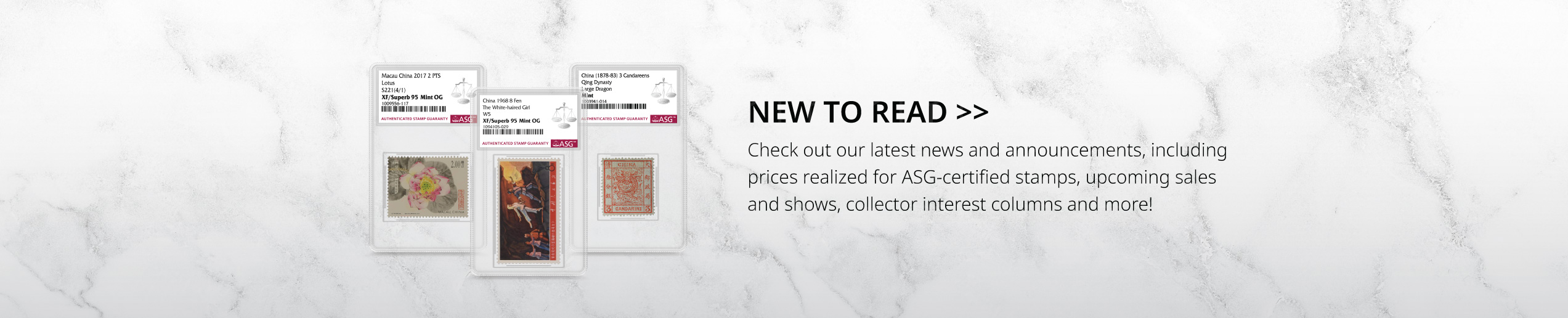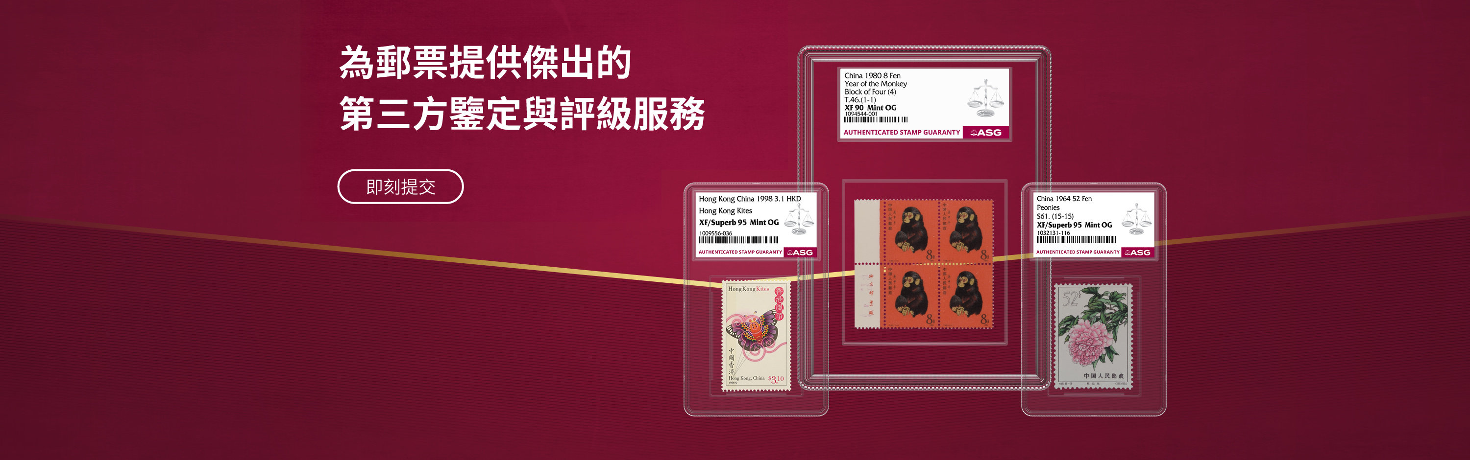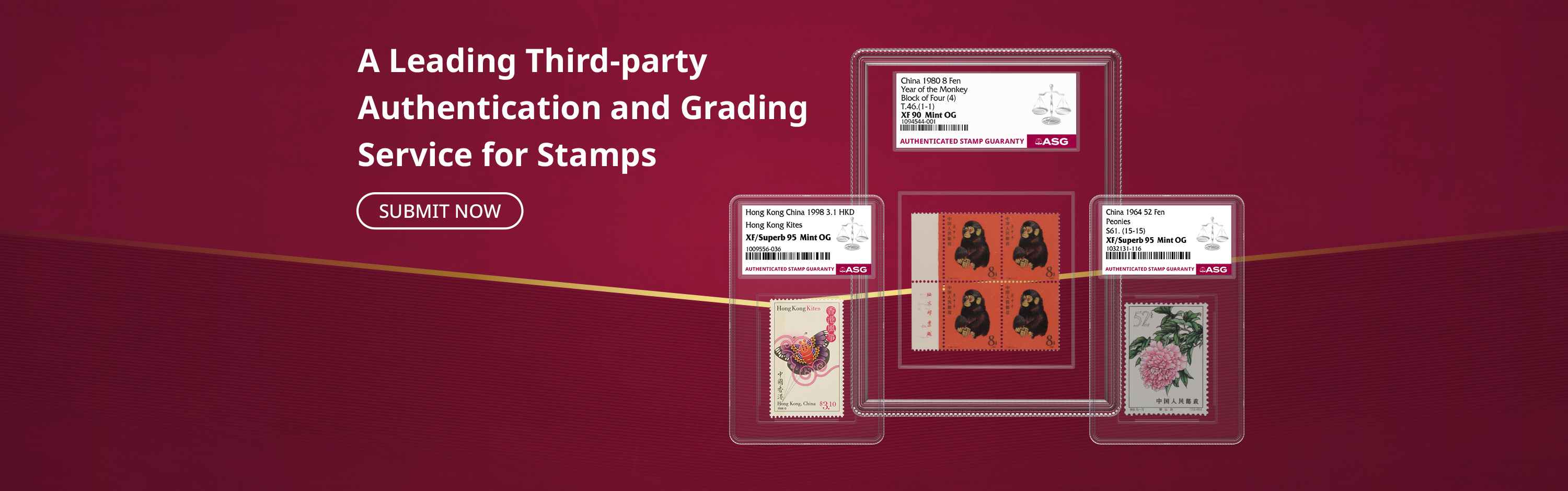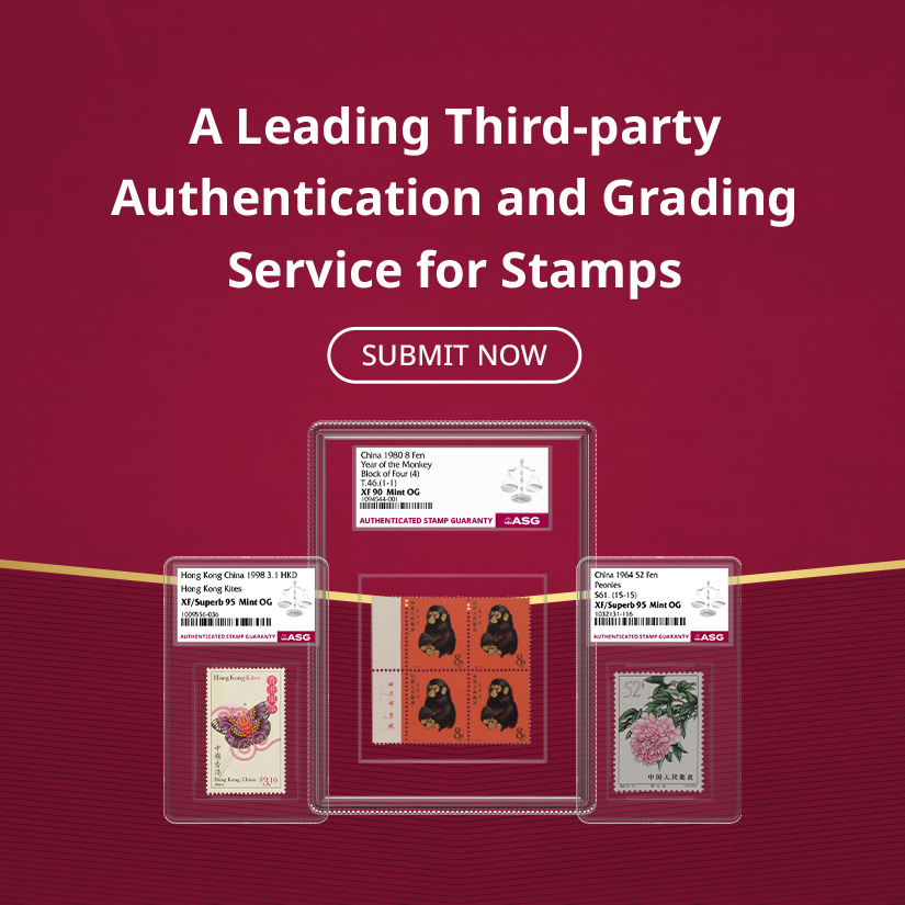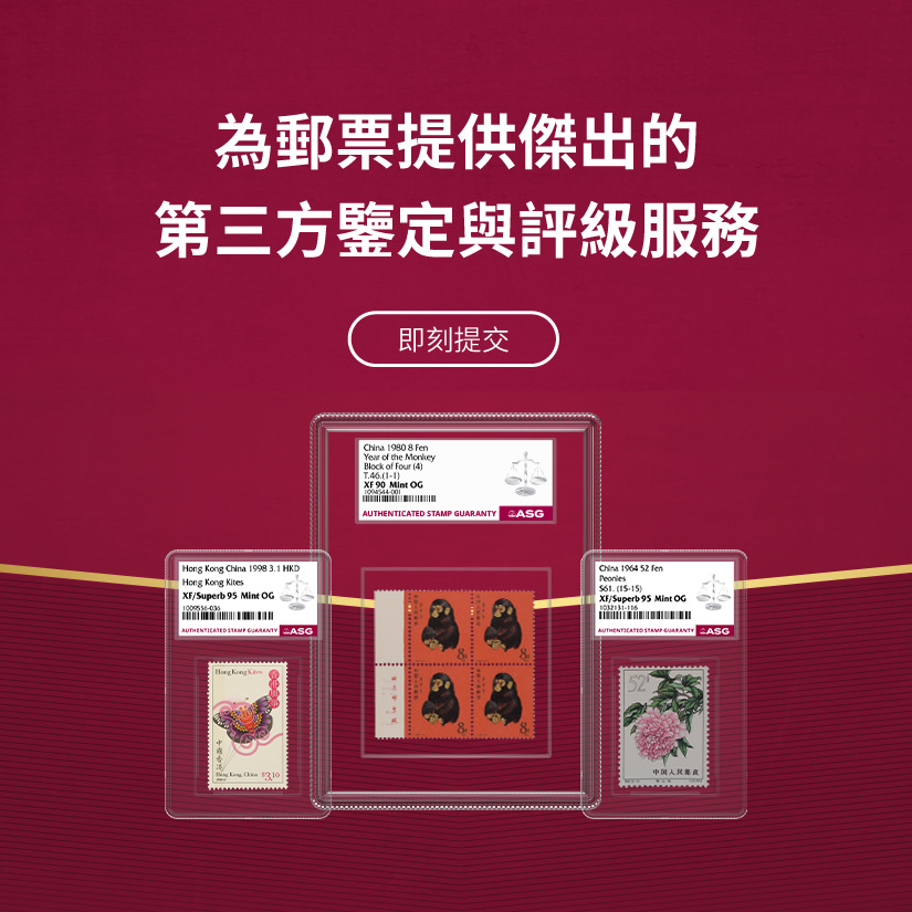 ASG為郵票提供精準、一致、專業與公正的評級服務。每一枚經ASG認證的郵票皆由完善的「ASG保證」為其真實性和評級等級保駕護航,從而給予買賣雙方有效保障。ASG是Certified Collectibles Group(CCG集團)旗下的成員公司,CCG集團致力於通過其服務激發藏家熱情、增添藏品價值及構建收藏社區。